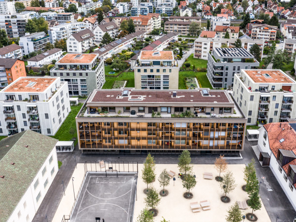 5 Punkthäuser mit je 13 Wohnungen, ein Langhaus mit 12 Wohnungen und Gemeinschaftseinrichtungen, eine unterirdische Autoeinstellhalle, ein durchgrünter Wohnhof sowie ein baumbestandener Quartierplatz bieten Platz für unterschiedliche Wohnformen und Zielgruppen.